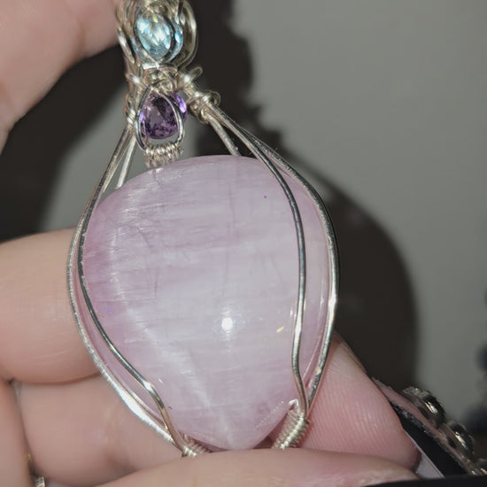 Kunzite Wrapped Pendant with Amethyst and Blue Topaz